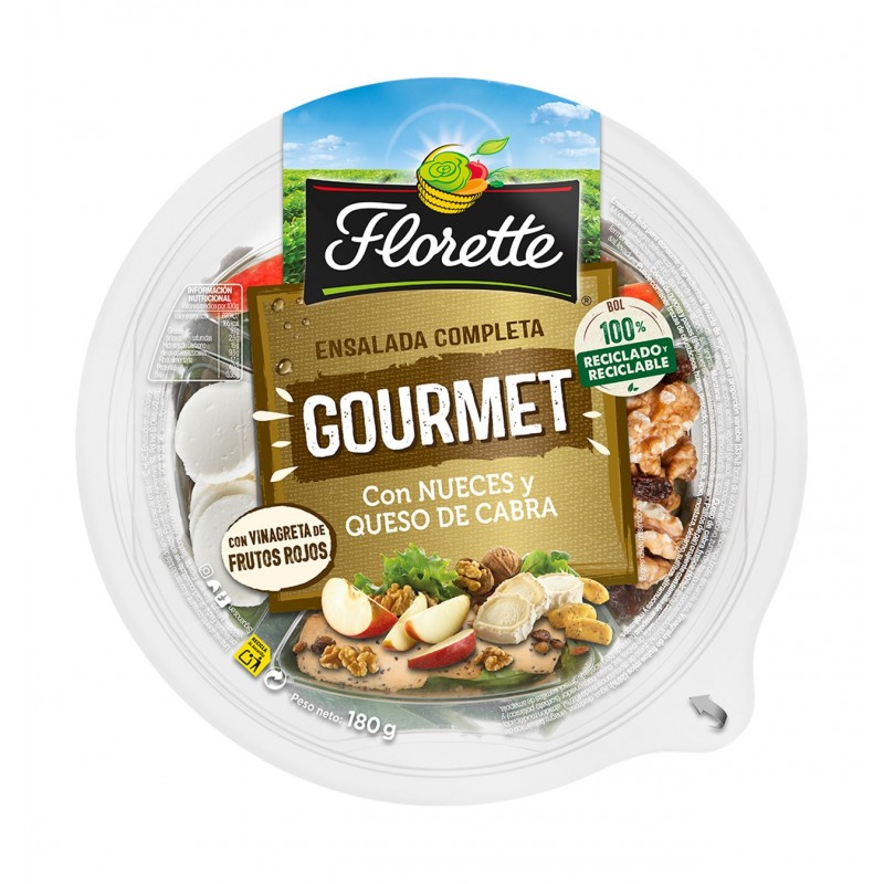 - Amanida (33%): Brots de fulla de roure vermella, brots d'espinac, escarola llisa. Vinagreta de fruits vermells (28%): Aigua, dextrosa, vinagre balsàmic, vinagre, oli vegetal (gira-sol), remolatxa en pols, suc concentrat de mora (0,6%), suc concentrat de gerd (0,6%), midó modificat, sucre, estabilitzant (E-415), antioxidant (E-300), sal, aromes. Poma (15%): poma, antioxidant (E-302). Formatge cabra (10%): llet pasteuritzada de vaca i cabra (mín. 2%), sal, quall, conservador (sorbat potàssic) i ferments làctics. Còctel de nous i panses (8%): nou sense clofolla (5,6%), pansa, oli de gira-sol. Palets de pa cruixent amb llavor de rosella (6%): farina de blat, oli de gira-sol, llavors de rosella, sal, llevat