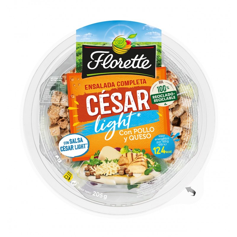 - Ingredientes: Mezcla de vegetales en proporción variable (40%): escarola rizada, radicchio, canónigo. Salsa césar light (24%): Agua, aceite de girasol, vinagre de vino, mostaza (agua, vinagre, mostaza, jarabe de glucosa y fructosa, sal, almidón modificado de maíz, estabilizantes (E412, E410, E407), especias, conservadores (E211, E202), colorante (E150d)), azúcar, sal, queso fuerte italiano, almidón modificado de maíz, aroma, yema de huevo, especias, estabilizantes (E415, E412), conservador (E202). Pollo (14%): pechuga de pollo, sal, dextrosa, aromas naturales, estabilizante (E451i), espesante (E407). Queso gouda light (12%): Leche pasteurizada de vaca, sal, cultivos lácteos, cuajo microbiano, colorante (caroteno), antiaglomerante (E460). Cubitos de pan de trigo integral tostados (10%): Harina de trigo, harina de trigo integral (3,1%), semillas de sésamo, aceite vegetal de girasol alto oleico, levadura, gluten de trigo, sal, harina de algarroba, antioxidante (ácido ascórbico).