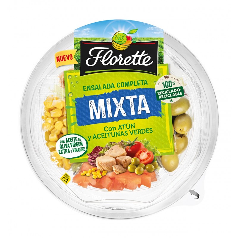 - Ingredients: Barreja de vegetals en proporció variable (37%): Escarola arrissada, xicoira, canonge. Tonyina en oli de gira-sol (18%): tonyina, oli de gira-sol, sal, tomàquet (13%). Blat de moro (11%): blat de moro dolç en gra, aigua, sal, acidulant (E-330). Oliva verda desossada (7%): oliva, sal, acidulants (àcid cítric, àcid làctic), antioxidant (àcid ascòrbic). Oli d'oliva verge extra (7%). Vinagre de vi balsàmic 6º (6%): Vinagre de vi, most de raïm concentrat, caramel de most (E-150d), conservador (metabisulfit potàssic) (conté sulfits). Sal iodada: sal, iode (60 mg/kg), antiaglomerant (E-535)