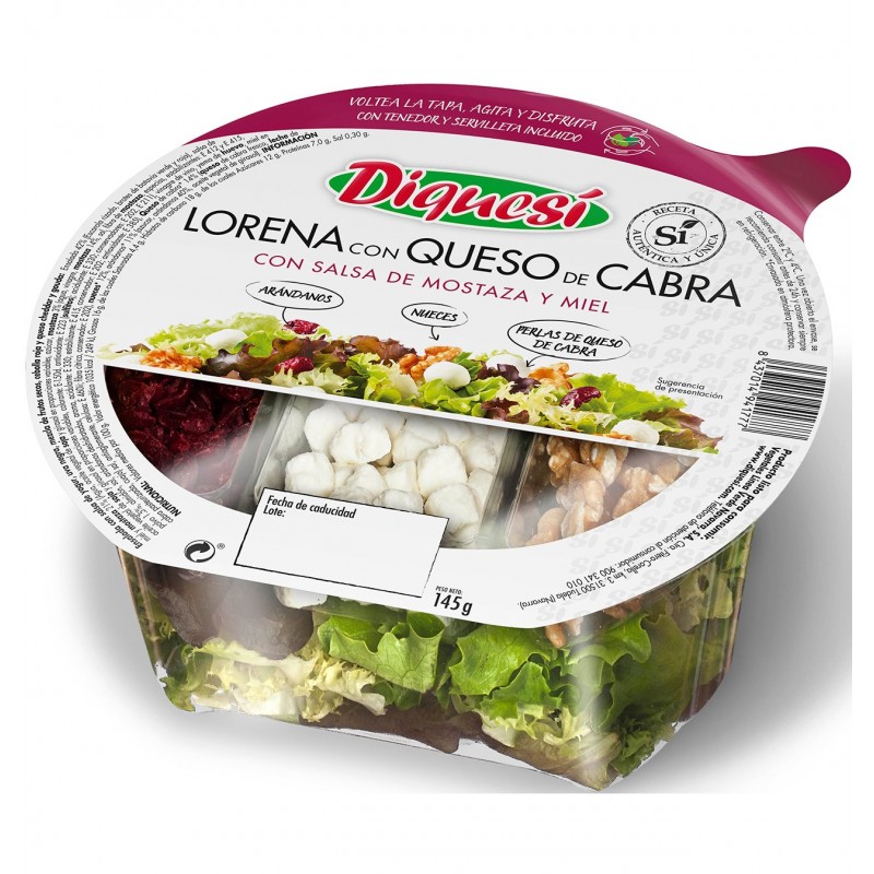 - Ensalada, Escarola rizada, Brotes de Batavia verde, Brotes de Batavia roja. Salsa de mostaza y miel (Salsa de miel y mostaza 21% (Agua, aceite vegetal de soja y girasol en proporciones variables, azúcar, mostaza 3% (agua, vinagre, mostaza 14%, sal, fibra de mostaza, especias, estabilizantes: E412,E415; aceite vegetal de soja y girasol en proporciones variables, colorante: E150d; antioxidante:E223 (Sulfitos); acidulante: E330, conservadores: E202, E211), vinagre de vino, yema de huevo, miel en polvo 1.5%, almidón, sal, arándanos deshidratados, aroma, acidulante: E330; estabilizante: E415, conservador: E202 y antioxidante E385). Queso de cabra (Queso de cabra fresco, leche de cabra pasteurizada, cuajo) sal, antiaglomerante, celulosa: E460ii; fibra cítrica, conservador: E202) Nueces Arándanos (Azúcar, arándanos, aceite vegetal de girasol)