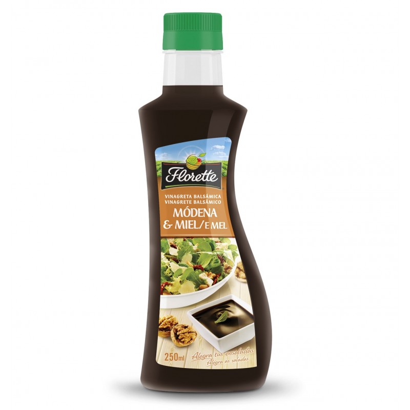 - Agua, azúcar, vinagre balsámico de Módena (5%), miel (3%), colorante (E150c), sal, aceite de girasol, acidulante (E260), estabilizante (E415), conservador (E202).