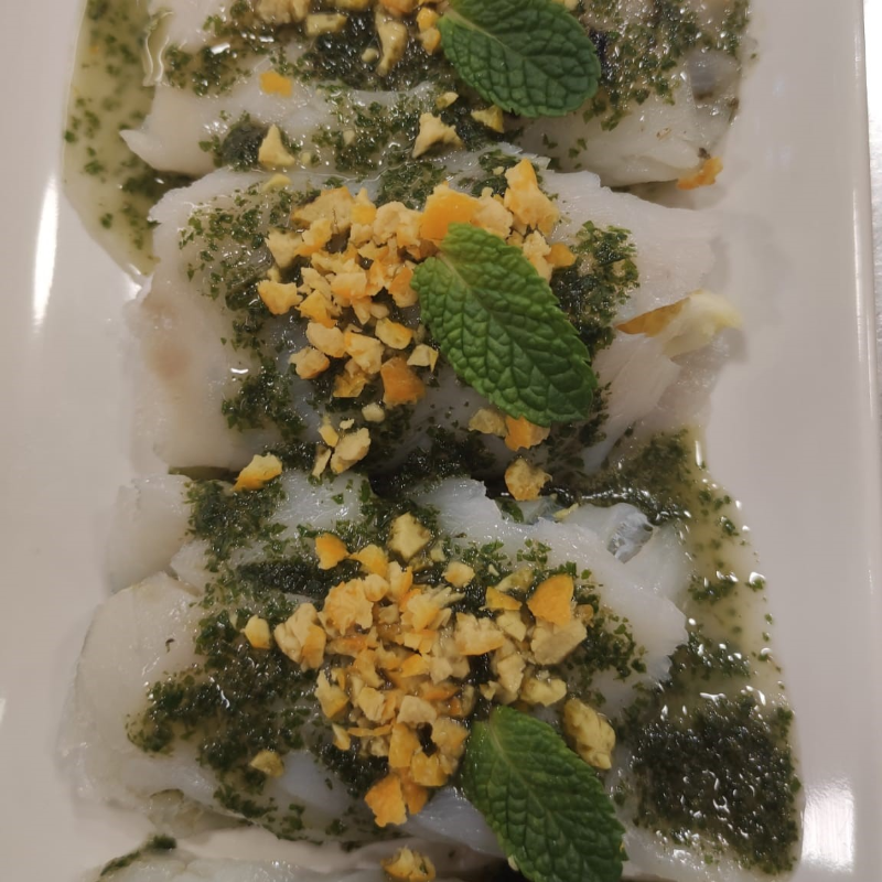 Rotllets de carpaccio de bacallà amb escalivada i oli de menta