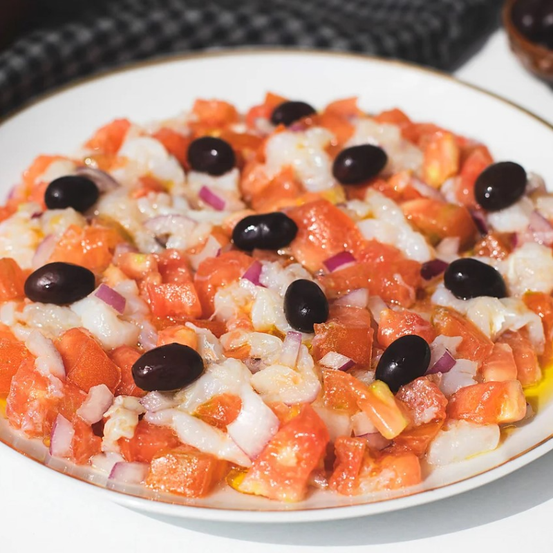 Esquena de bacallà amb pebrot, tomàquet, ceba i olives d'Aragó