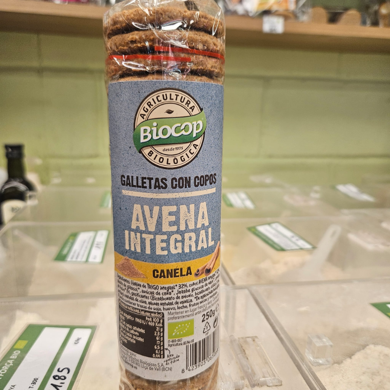 INGREDIENTS: farina de blat 35 %, flocs civada integral 34%, oli gira-sol, sucre de canya, xarop glucosa de blat de moro, canyella en pols 1%, gasificant (bicarbonat d'amoni, bicarbonat òdic), sal, extracte natural d'oliva, aroma natural de vanilla.