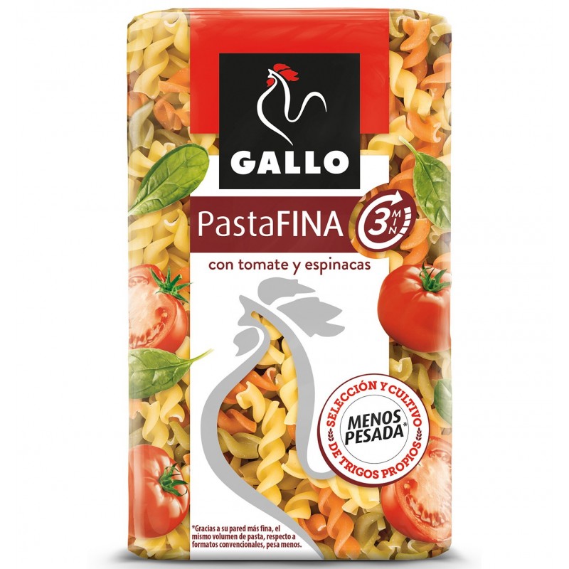 - Ingredientes: sémola de trigo duro. Pasta alimenticia compuesta a las espinacas. Ingredientes: sémola de trigo duro, espinacas deshidratadas (2,5%). Pasta alimenticia compuesta al tomate. Ingredientes: sémola de trigo duro, tomate concentrado 28/30ºBrix (5%). Puede contener trazas de huevo